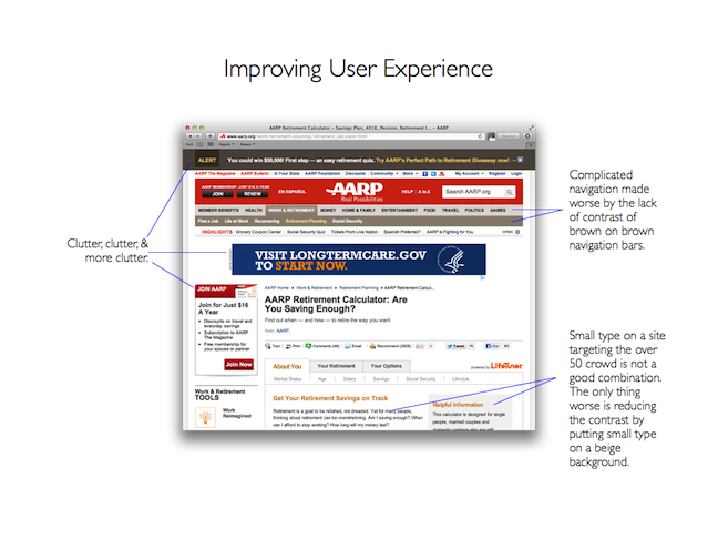 There is no better way to illustrate how to improve user experience than to breakdown a page. I recently ran across the AARP's retirement calculator page as I was doing research for my posts at financialmarketingnews.com. AARP.org is a site targeted at the 50+ crowd - a group that is quickly adopting the technology but is less willing to spend time with a site with a complicated user experience.